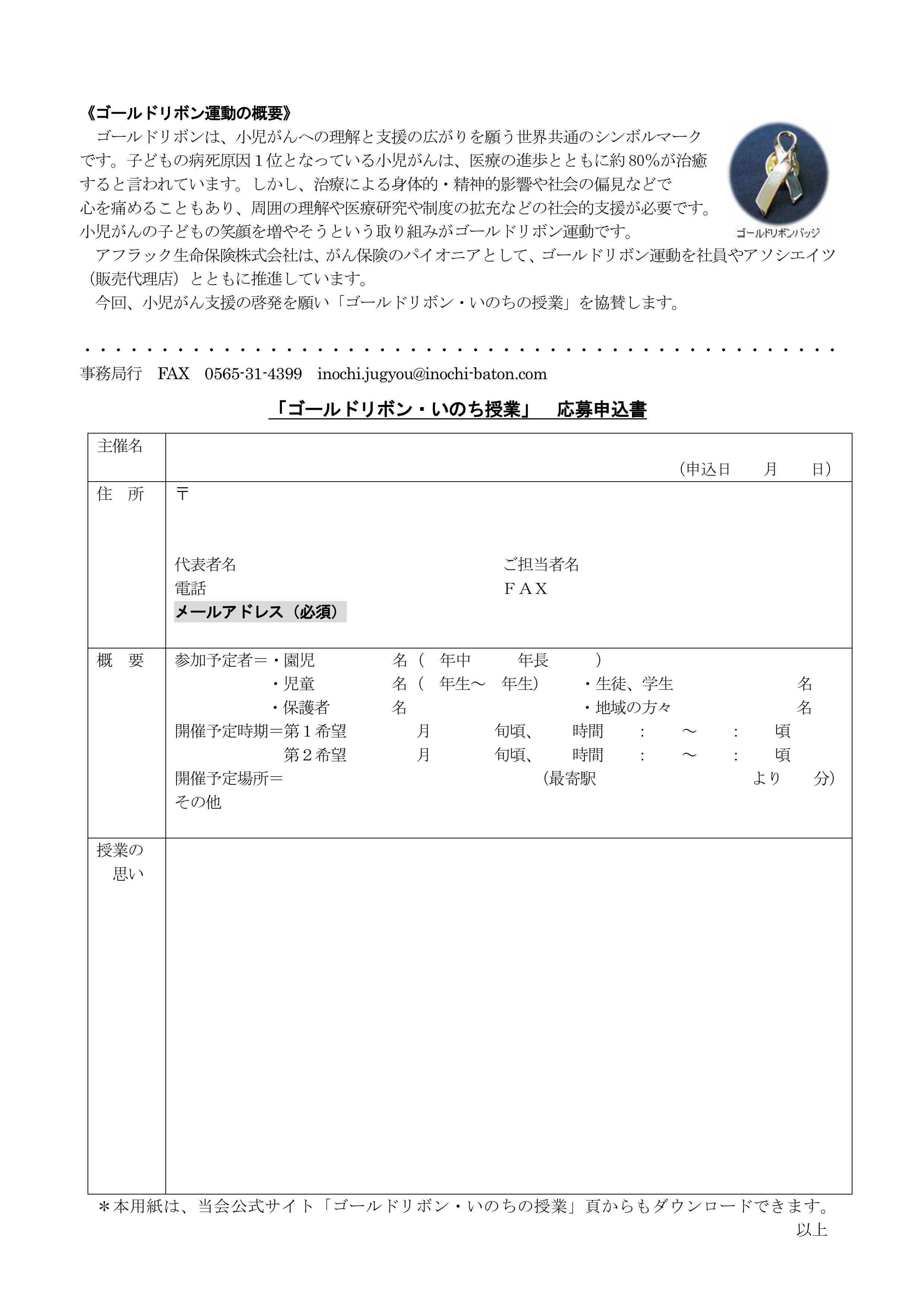 ・詳細は、本サイト「ゴールドリボン・いのちの授業」 または「募集チラシ(PDF)」をご覧ください。
